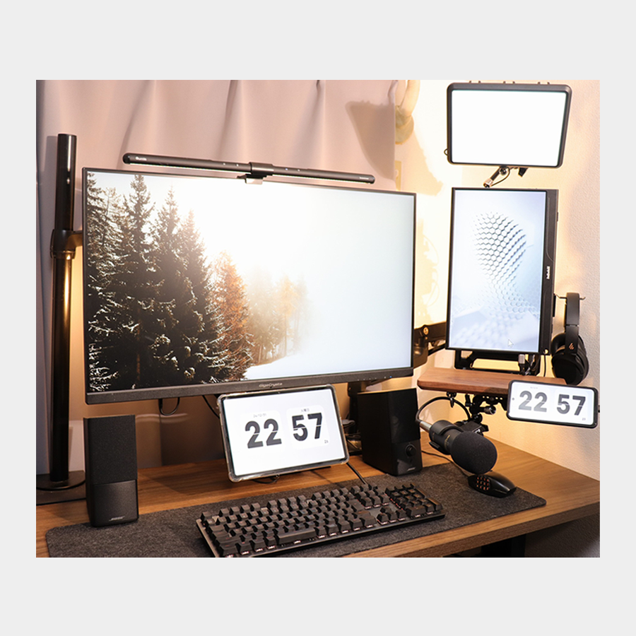 ➡ 使用した製品を確認複数のガジェットを組み合わせたステーションを作成。大型照明でデスク全体を明るく照らし、裏面に配置した給電器により、複数の機器への充電・給電を同時に実現します。ミニシェルフを取り付けることで小物類の置き場にも新しいスペースを提供します。