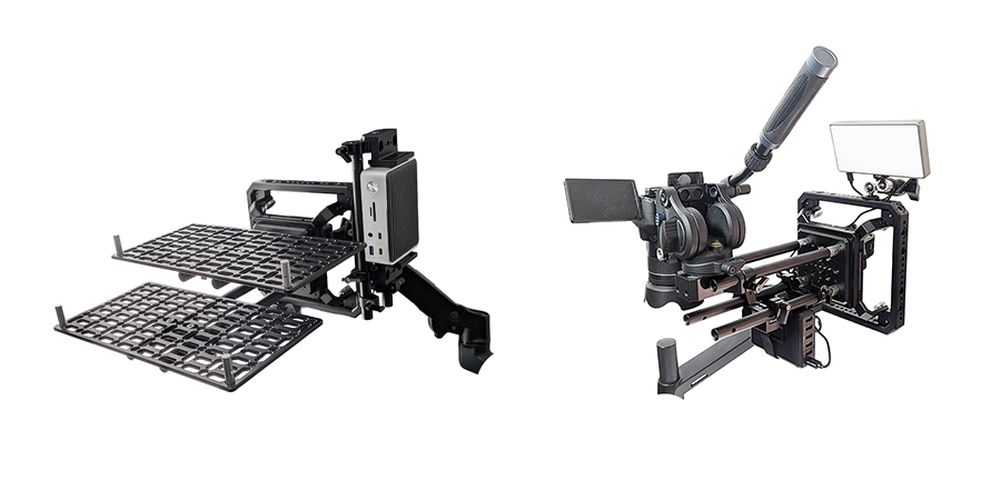 「DeskRig/RearBase」を使用することで、モニター背面のレイアウトの幅が広がります。本体へロッドを接続してフレームを構築することで、従来は手間を要した位置への機材配置も自在に実現できるほか、回転・捻じれを防止するARRIスロットを各所に配置することで安定感のある組み合わせを実現できます。