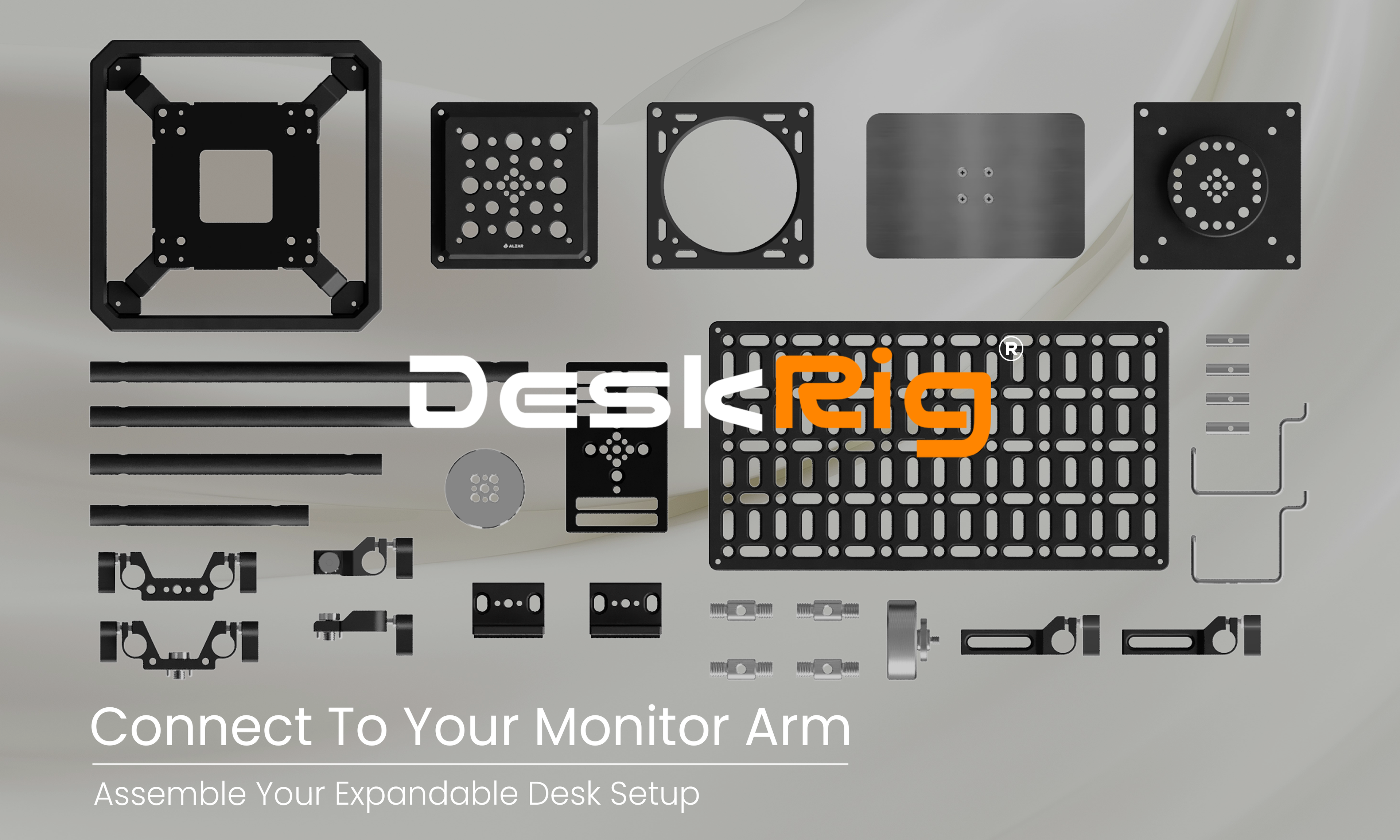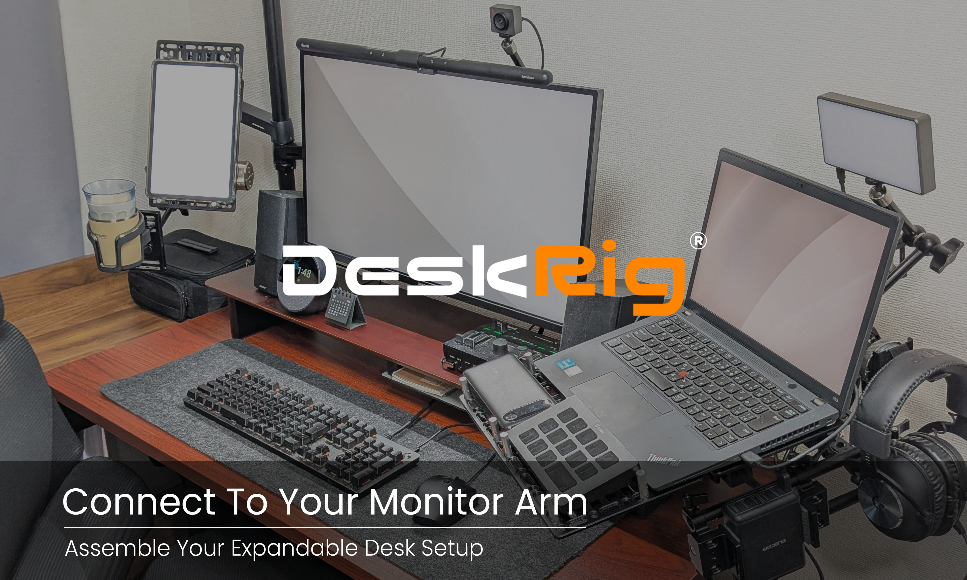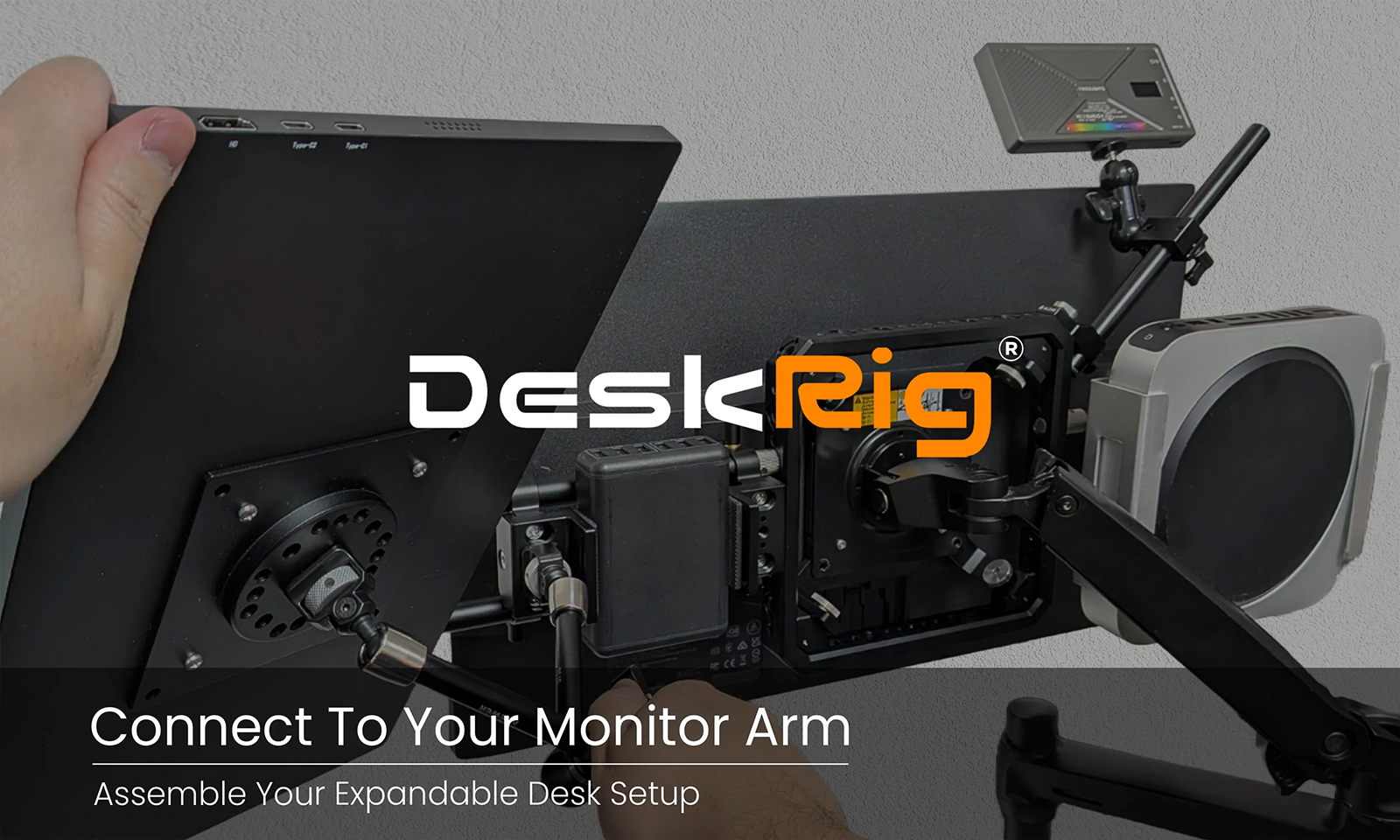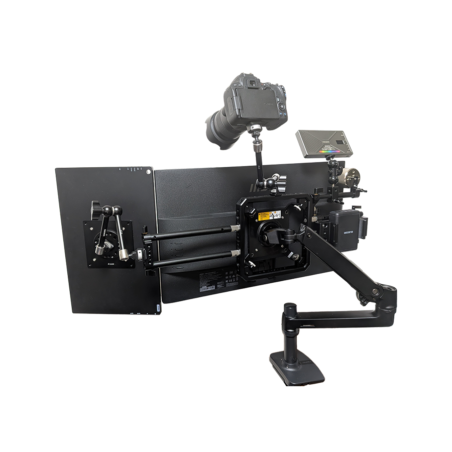 「DeskRig」は、モニターアームに接続して使用するマルチマウントツールです。カメラリグと共通の規格を採用し、リグ同士を繋ぐという簡単な工程だけで自在なフレーム構成とセットアップを行うことが可能です。デスク向け機材の固定や位置調整に特化した設計により、撮影・収納・ワークステーションなど、用途に応じた最適なデスク環境をスピーディーに構築できます。