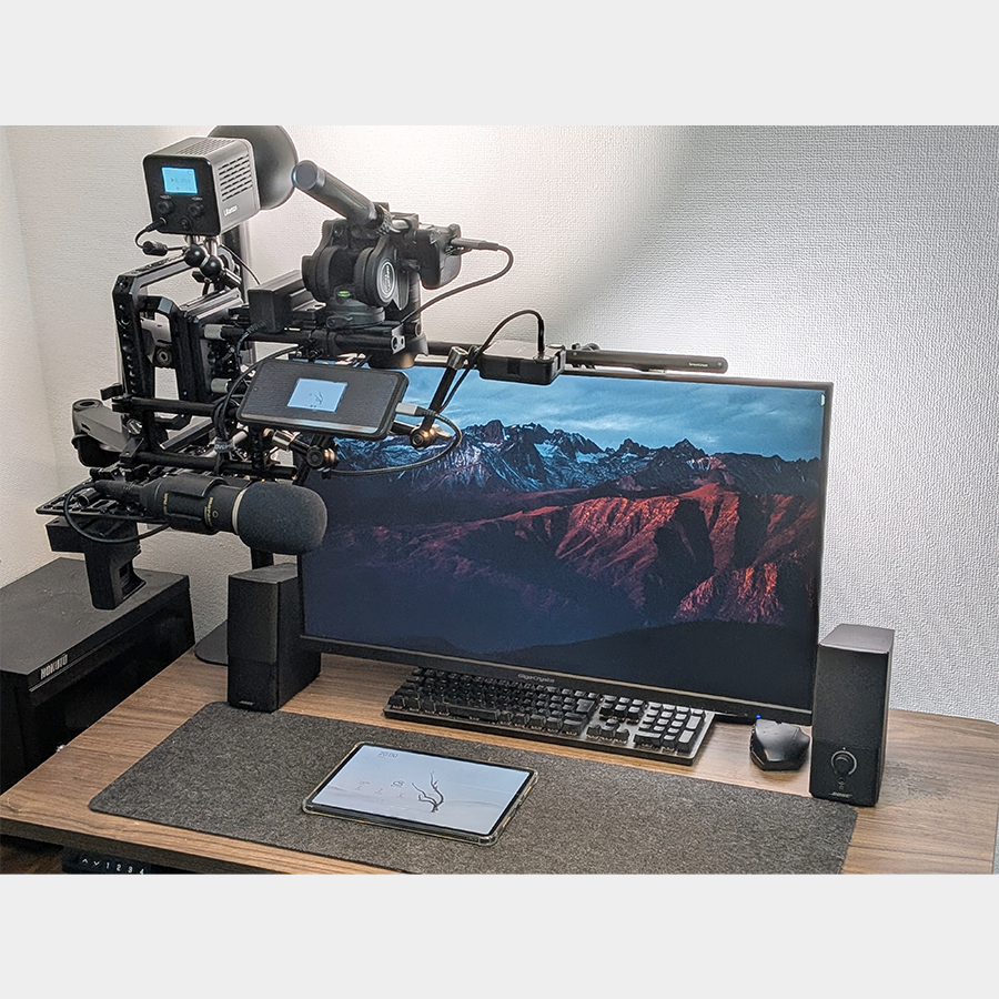 ➡ 使用した製品を確認カメラ、外部モニター、マイクを全てセンターに揃えた俯瞰撮影構成を作成。外部モニターで映像を確認しながらマイクによる同時収録を可能にします。モニターアームの可動域を活かすことで、未使用時はデスクサイドへ移動させておくことができます。