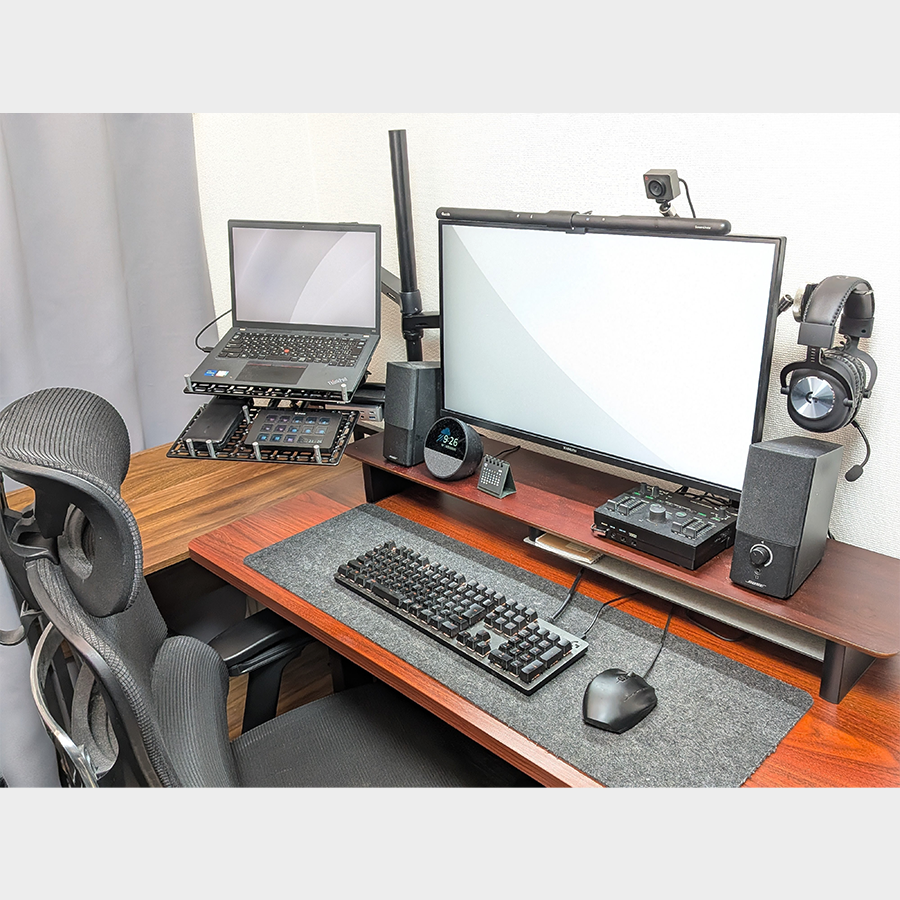 ➡ 使用した製品を確認ノートPCとガジェットを空中配置できる2段ラックを作成。27インチモニターの背面にはwebカメラとヘッドセットを保持できるよう組み合わせ、カウンターウェイトで左右のバランスを調整することで、デスク上のスペースをより広く使用することができます。